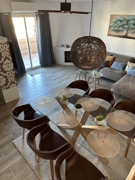 Ve spodním patře se nachází vstupní hala, jídelní kout, obývací místnost s velkou smart televizí, kuchyňský kout, koupelna s wc, 2 ložnice, terasa s bočním výhledem na moře a vstup do horního patra po úzkém schodišti.